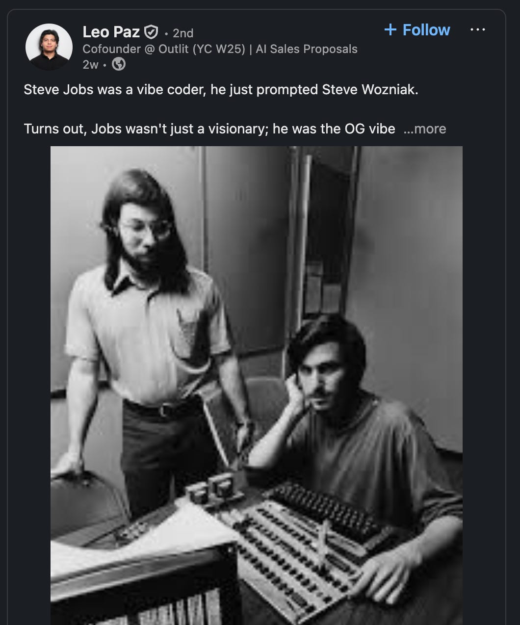 Recently I saw a LinkedIn post from a freshly minted Y Combinator founder who said, "Steve Jobs was a vibe coder, he just prompted Steve Wozniak." This perfectly captures how we're thinking about intelligence management: find someone (or something) smart, give them commands, and expect magic.
